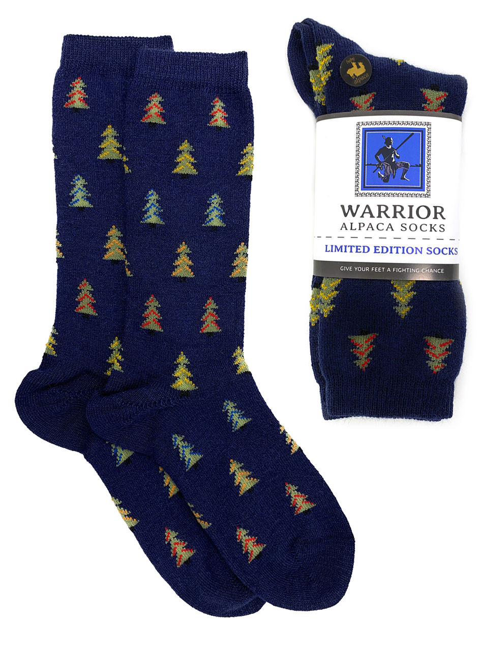 Spread Holiday Cheer with these baby alpaca Holiday Christmas Tree socks. These dress weight alpaca socks make the perfect holiday gift for men or women, adorned with pine trees in all their holiday splendor with a midnight navy background.