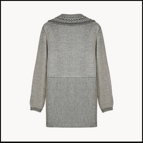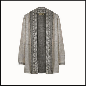 Broad crocheted shawl collar and lapels in contrasting melange are visually slimming.
