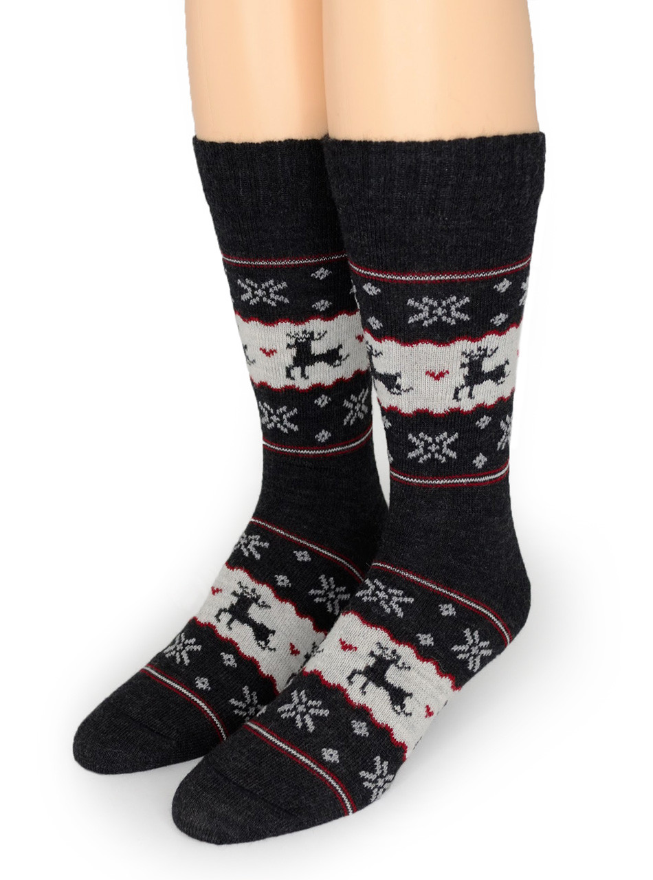 Our Reindeer Holiday Alpaca Wool Socks have just the right amount of pattern coupled with great style and color. Fashioned from our alpaca yarn these socks feature leaping reindeer along with snowflakes and hearts.